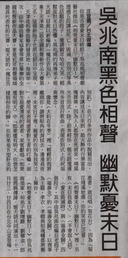 〔中國時報〕吳兆南黑色相聲 幽默憂末日